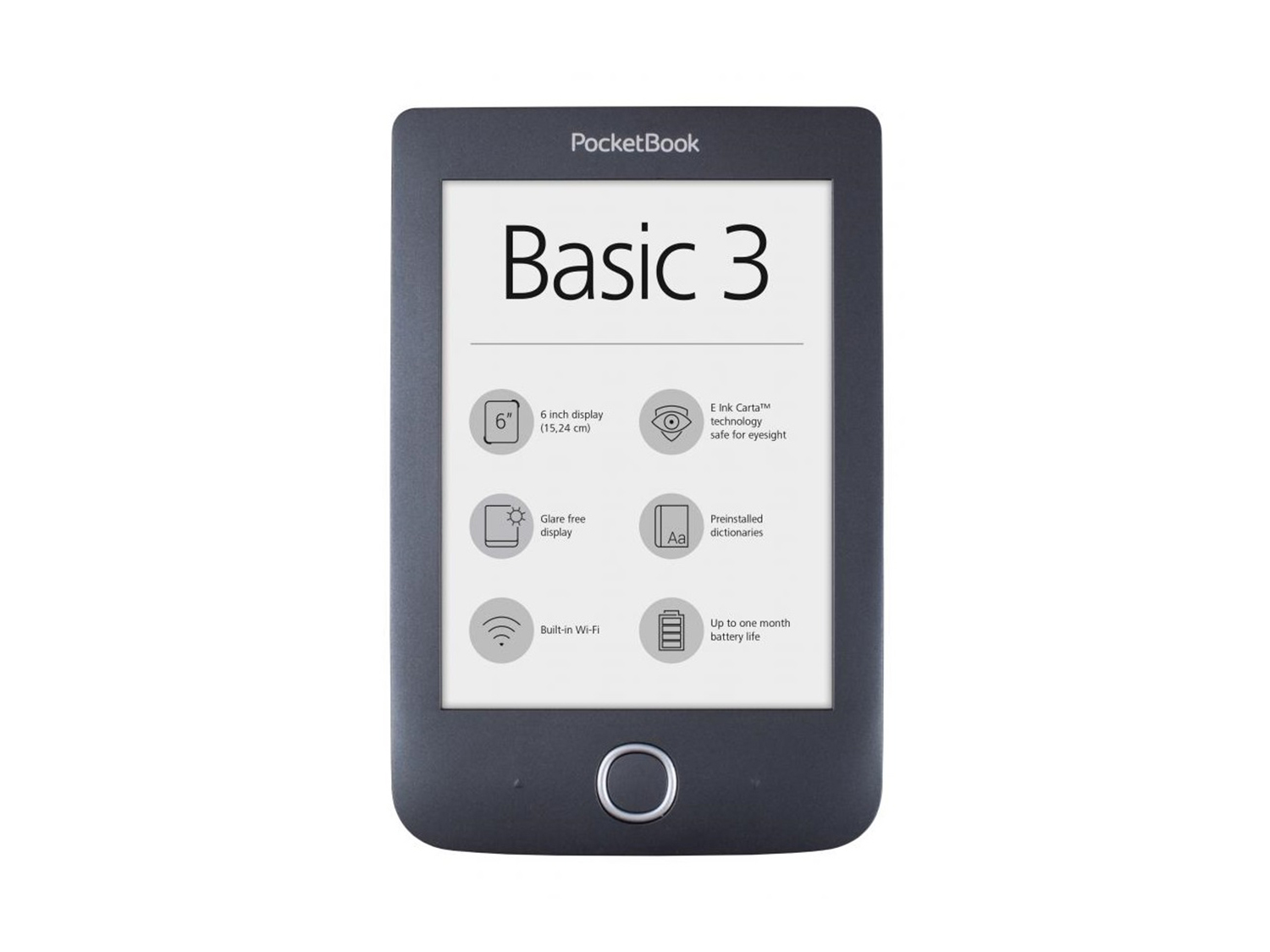 PocketBook Basic 3 - новият електронен четец с базова конфигурация с 6-инчов екран E Ink Carta™ от последно поколение и вграден Wi-Fi модул за удобно четене, докато сте в движение. Интуитивен потребителски интерфейс, намалено тегло, добър контраст на екрана, вградени речници - всички тези функции правят PocketBook Basic 3 идеален за тези, които ценят простотата и удобството. Оптималният набор от функции позволява още по-икономично използване на заряда на батерията, което гарантира до един месец четене без презареждане.