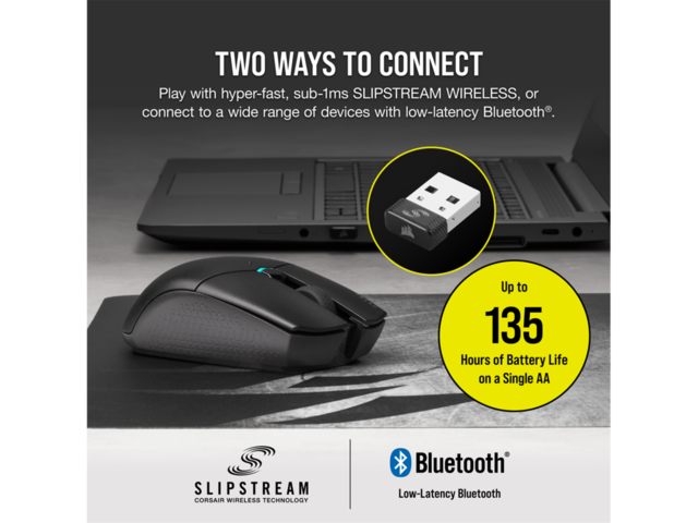 - Играйте с хипер бързи, под 1 ms SLIPSTREAM CORSAIR безжична технология или се свържете с широк спектър от устройства с ниско латентно Bluetooth®, захранвано само от една AA батерия.