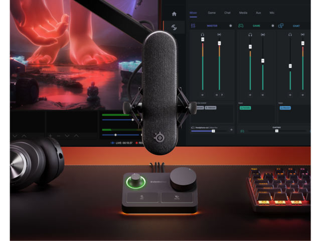 - XLR Stream mixer се свързва с компютър чрез USB и разполага с персонализирани контроли и RGB