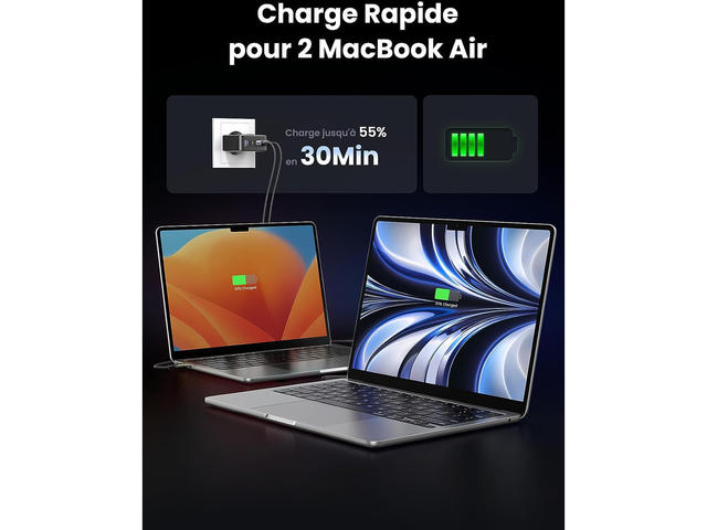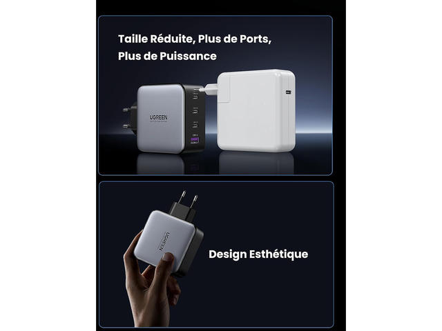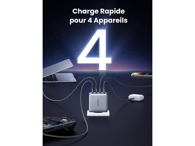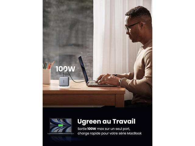 - UGREEN 100W USB C поддържа Power Delivery 3.0, Quick Charge 4.0+/3.0, SCP, AFC, 5V/2.4A, Galaxy Super Fast Charging II, PPS за бързо зареждане. MacBook Pro 16" се зарежда от 0-42% само за 30 мин. С 3х USB-C порта и 1х USB-A порта е светкавично бърз и безпроблемен за едновременно зареждане на 4 устройства. Поддържа 20W USB C изход за мобилни телефони.