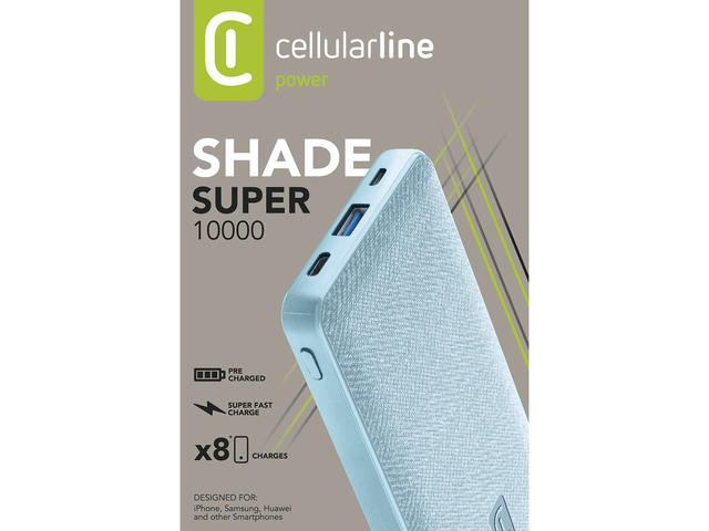 Външната батерия SHADE от Cellularline съчетава дизайна с технологията. Модерното покритие от плат прави тази външна батерия уникална, но също така гарантира здрав захват и е приятна на докосване. Благодарение на системата Device Detect, SHADE 10000 разпознава свързаните устройство и активира най-подходящата технология за зареждане, захранвайки до 18 W мощност. SHADE 10000 гарантира висока производителност на зареждане благодарение на своите усъвършенствани технологии: