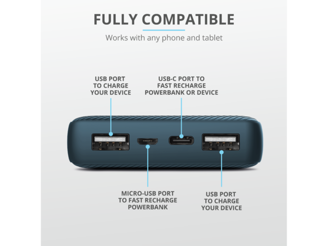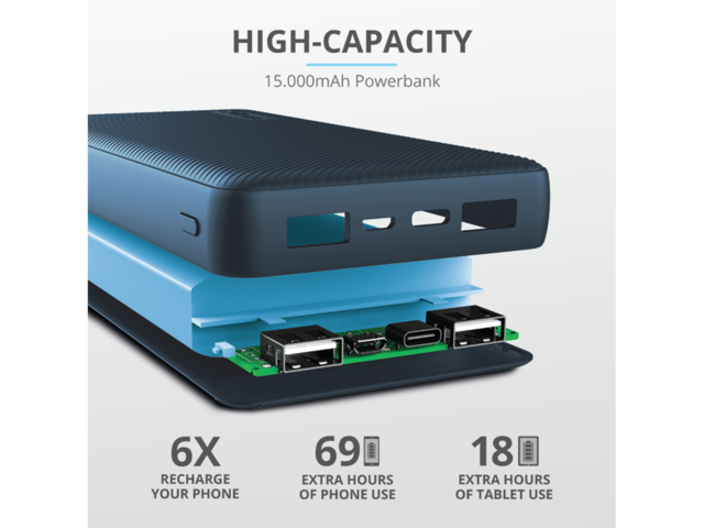 Външната батерия Trust Primo 15.000 mAh е бърза и умна: тя автоматично ще предостави максималния заряд на всички устройства**. Бързо заредете външната батерия с включения micro-USB кабел или чрез USB-C: вграденият смарт светодиоден индикатор за капацитет ще ви уведоми, когато е готова!