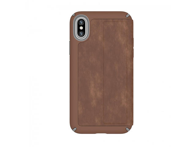 - Калъфа Speck Presidio Folio е изработен от висококачествена кожа. Конструкциятя на калъфа покрива вашия iPhone X изцяло благодарение на солидния преден капак, който се затваря плътно и надеждно и предпазва всеки милиметър от корпуса на телефона. И предната и задната част на устройството. Presidio Folio са изработени, посредством патентованата двуслойна технология на Speck.За максимално удобство, капакът може да се свива на 360 градуса.