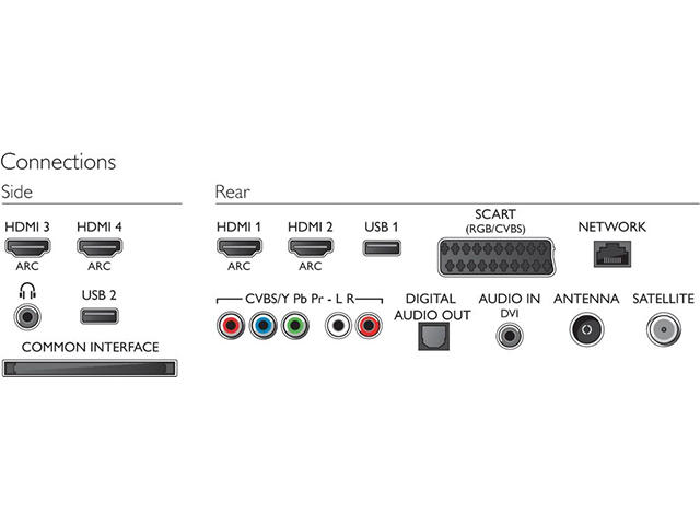 - Други връзки: CI+1,3 сертифицирана, Аудио вход (DVI), Антена IEC75, Общ интерфейс Plus (CI+), Ethernet-LAN RJ-45, Цифров аудио изход (оптичен), Аудио вход Л/Д, Изход за слушалки, Сервизен съединител