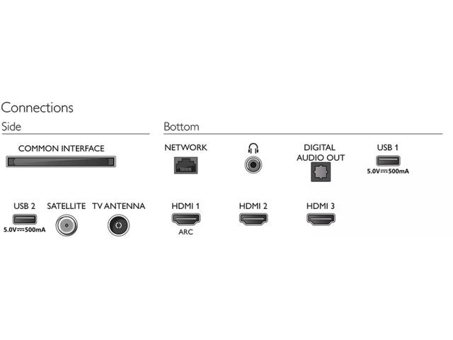 - Други връзки: Сателитен конектор, общ Интерфейс Plus (CI+), цифров аудиоизход (оптичен), Ethernet-LAN RJ-45, Изход за слушалки, Сервизен