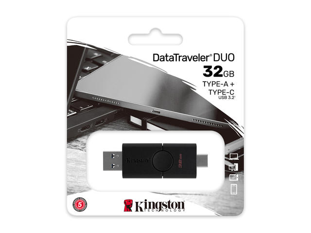- DataTraveler® Duo на Kingston разполага с два USB конектора, които работят както със стандартните портове USB Type-A, така и с USB Type-C®1.