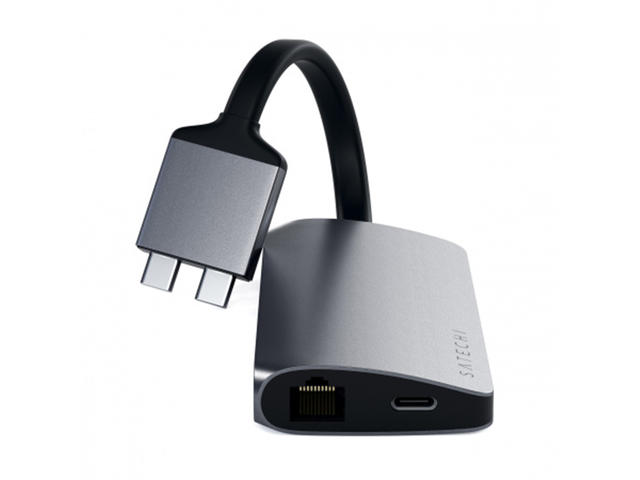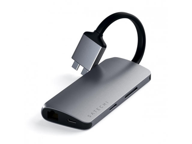 - Двойният мултимедиен адаптер има порт за всяка периферия с два 4K HDMI, USB-C PD зареждане, Gigabit Ethernet, четци за микро / SD карти и USB 3.0 портове.