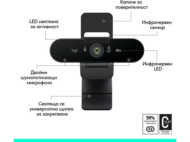 Съвместимост: Windows 8 или по-нова версия; macOS 10.10 или по-нова версия; ChromeOS; Windows Hello; Microsoft DirectShow;