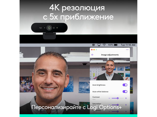 - Повишете нивото на видео срещите до първокласно с уеб камерата Brio 4k. Ultra 4K HD улавя всеки детайл, а технологиите RightLight 3 и High Dynamic Range (HDR) се настройват автоматично, за да ви помогнат да изглеждате най-добре при всякаква осветеност