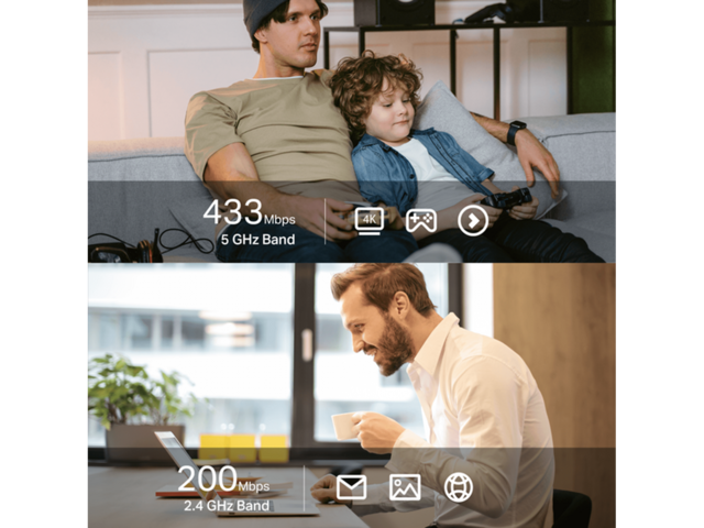 - Високоскоростен WiFi – до 600 Mbps скорости с 200 Mbps на 2,4 GHz и 433 Mbps на 5 GHz, надгражда вашите устройства до по-високи AC WiFi скорости.