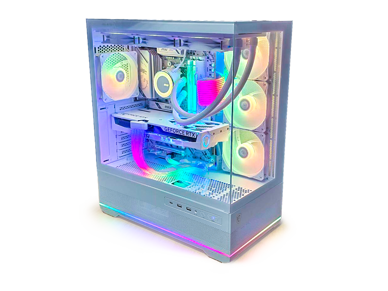 RGB ефектите на вентилаторите и осветлението се управляват с бутон на предния панел и/или чрез софтуер при синхронизация с дънната платка. Компоненти с RGB, като RAM памети, се контролират чрез софтуера на производителя или на дънната платка (MSI Center, ASUS Armoury Crate и др.)