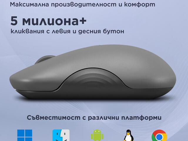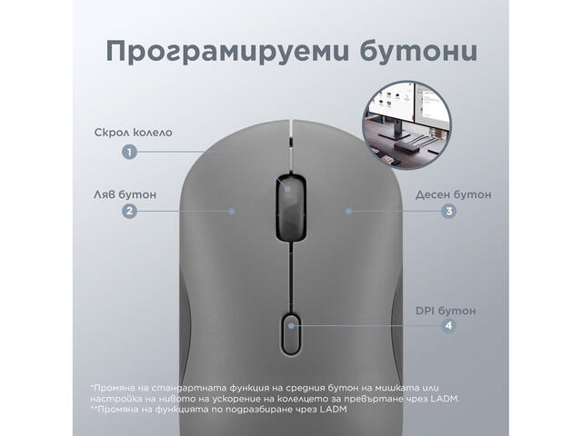- Програмируеми бутони: 6 бутона (ляв, десен, скролване, DPI, превключване на канали и сдвояване, включване/изключване)