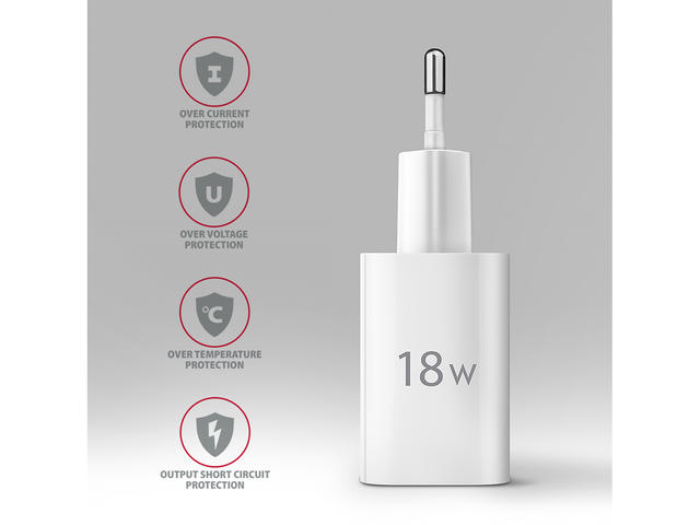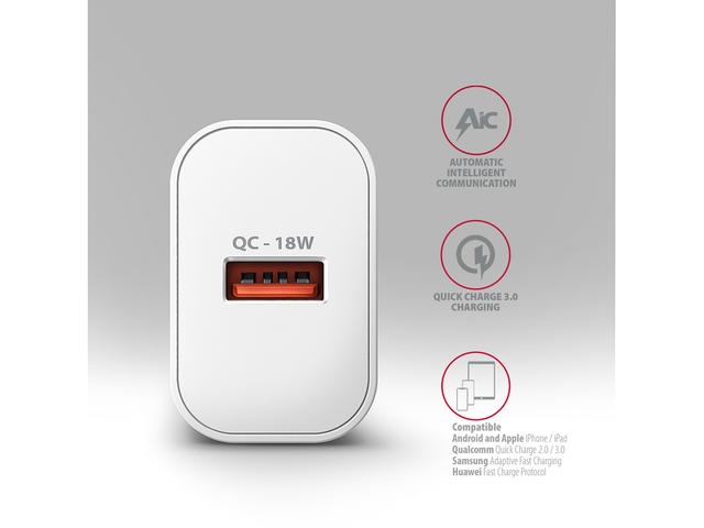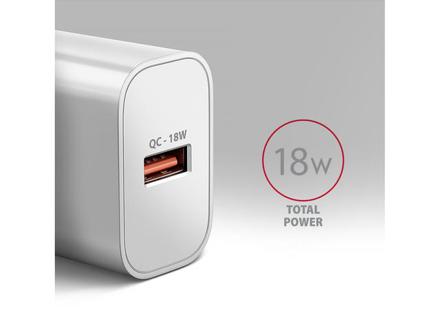 - USB стенното зарядно устройство AXAGON ACU-QC18 е предназначено за зареждане на мобилни устройства. С максимална мощност от 18 W зарядното устройство зарежда телефони, таблети и други мобилни устройства с възможно най-висока скорост. Адаптерът предлага стандартен USB-A конектор.