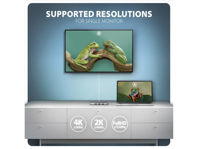 - За видео изход, хъбът трябва да бъде свързан към USB-C порт с поддръжка на DisplayPort Alternate Mode (DP Alt Mode) или към USB-C порт с поне Thunderbolt 3 поддръжка. Освен това са необходими подходяща актуализирана операционна система и актуални драйвери за графични карти.