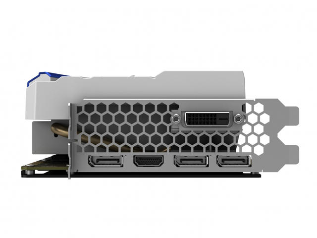 Както казахме, размерът на платката е по-голям от тази на референтната. Въпреки това, „отличителният белег“ е височината на GeForce GTX 1080 GameRock/Premium Edition. Отстрани, където се намира I/O панелът забелязваме така наречената „Honeycomb Bracket” пластина. Според Palit, този тип дизайн увеличава въздушния поток до 15%, позволявайки на отделения от чипа топъл въздух да излезе отстрани на видеокартата.