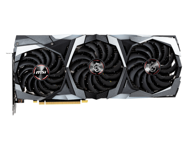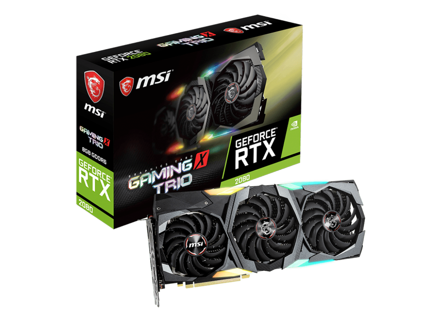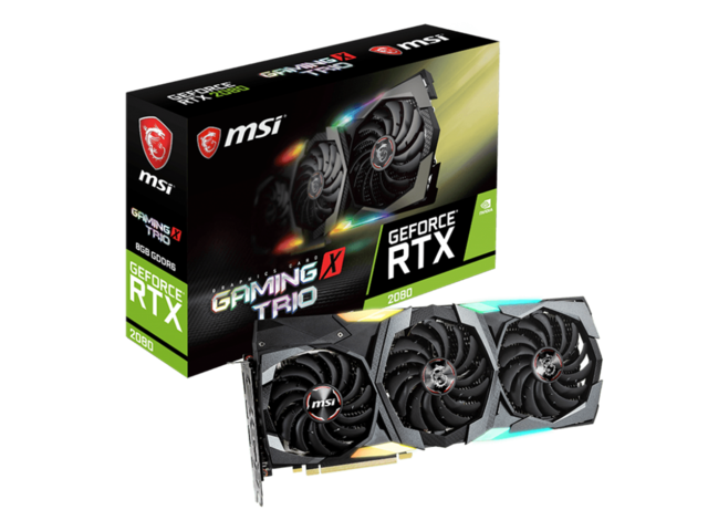 GeForce RTX 20 Series GAMING TRIO е завръщането на мощната графична карта с три вентилатора на MSI. Серията TRIO се отличава със смесица от черно и червено метално тяло с елегантни форми и елегантна метална облицовка, която съвпада с предната част. Това изглежда чудесно с великолепните RGB ефекти, открити отпред и отстрани на картата, които могат да се управляват с помощта на софтуера на Mystic Light на MSI и да се синхронизират с други RGB компоненти.