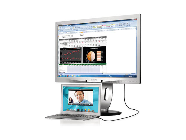 Този иновационен голям дисплей Philips позволява лесна репликация на портовете за всеки преносим компютър. Особено подходящ за най-новите устройства Ultrabook с ограничен брой съединители, този дисплей с вграден USB 3.0 концентатор, Ethernet и стерео тонколони ви позволява да предавате видео и аудио и да се свързвате с Интернет, чрез един единствен USB кабел.