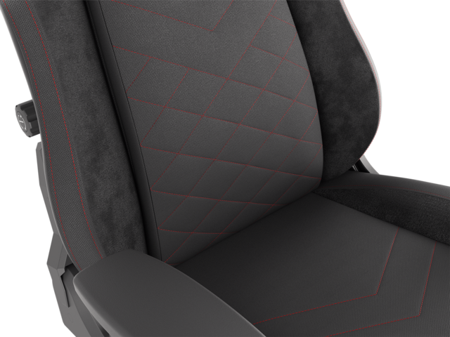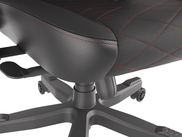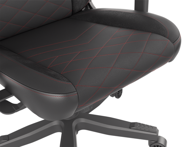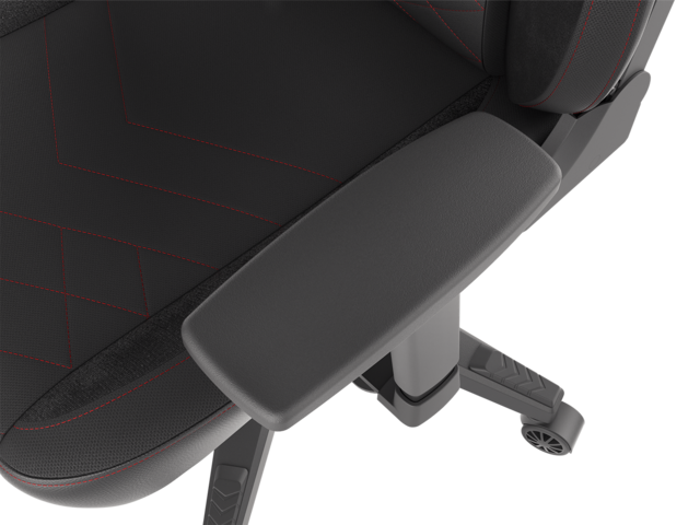 - Този стол е изключително ергономичен и разполага с вградена регулируема лумбална опора. Той има седалка с голяма повърхност, която е направена от мека черна тъкан и голяма облегалка с модерни червени обшивки.