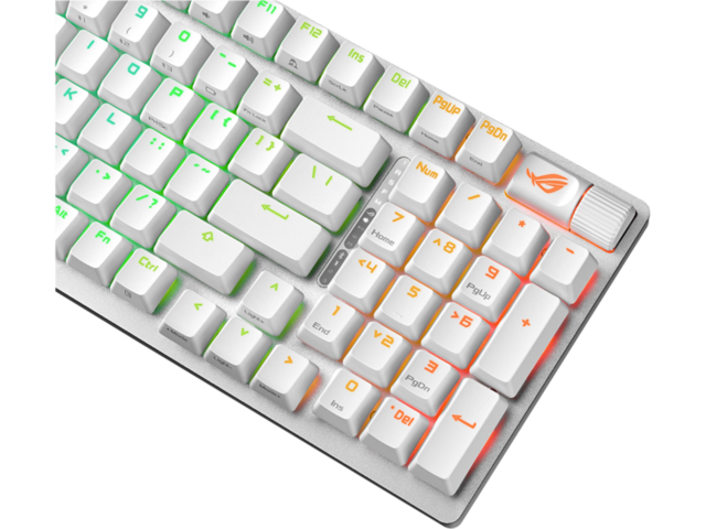- Подобрено преживяване при писане: Предварително смазаните стабилизатори на клавиатурата създават по-малко триене за по-гладки удари и стабилност за по-дълги клавиши; издръжливите ROG PBT двойни капачки или ABS капачки с UV покритие предлагат първокласно усещане и устойчивост на лъскавина