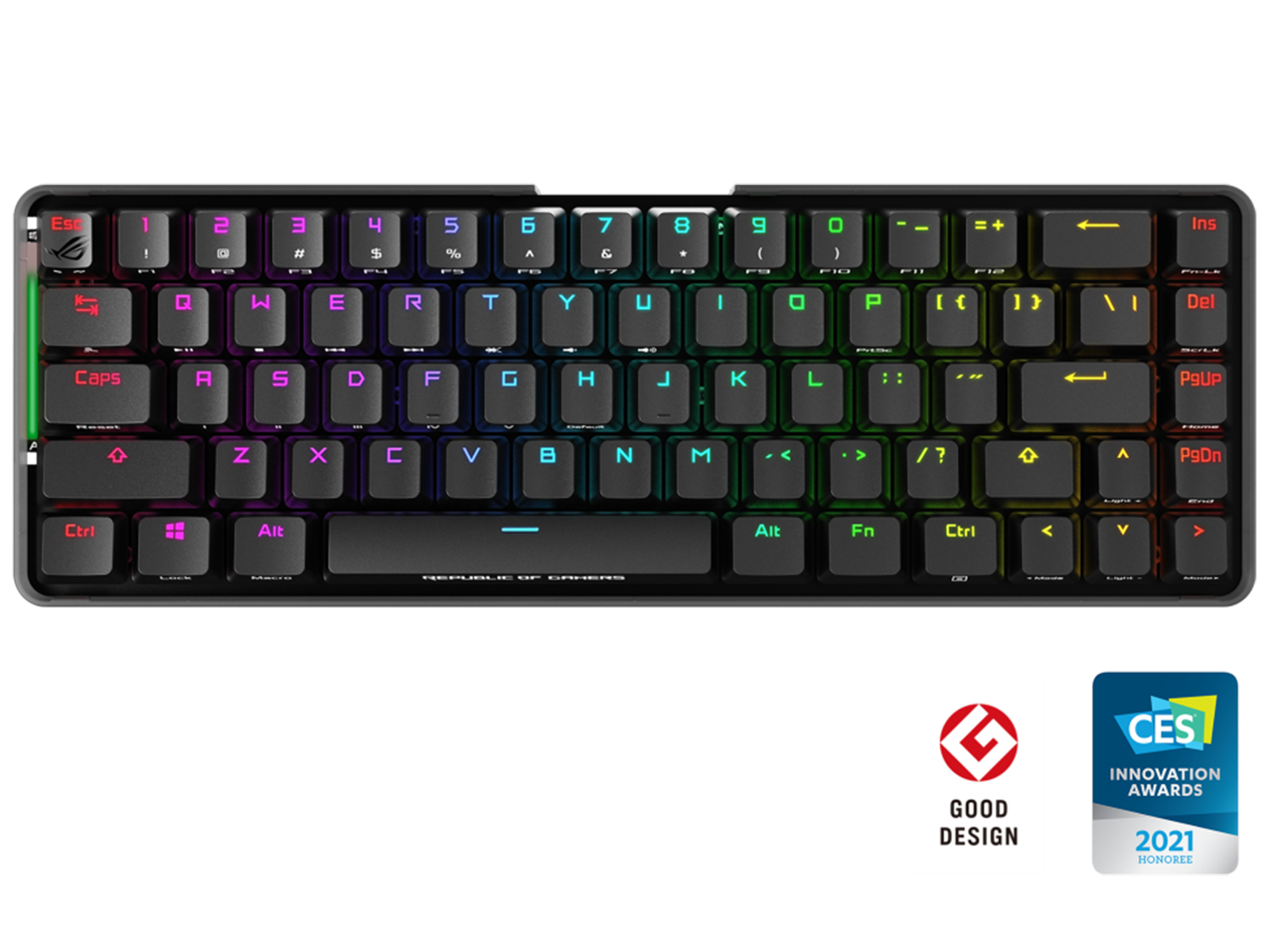 - Компактното 65% оформление майсторски включва стрелки и клавиши за навигация в 60% рамка на клавиатурата