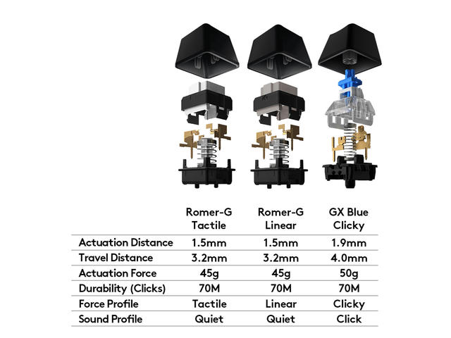 G513 е оборудвана с механични Romer-G суитчове, които са разработени от Logitech. Те са изключително бързи, надеждни и издръжливи. Romer-G суитчовете са тествани и имат живот над 70 милиона клика.