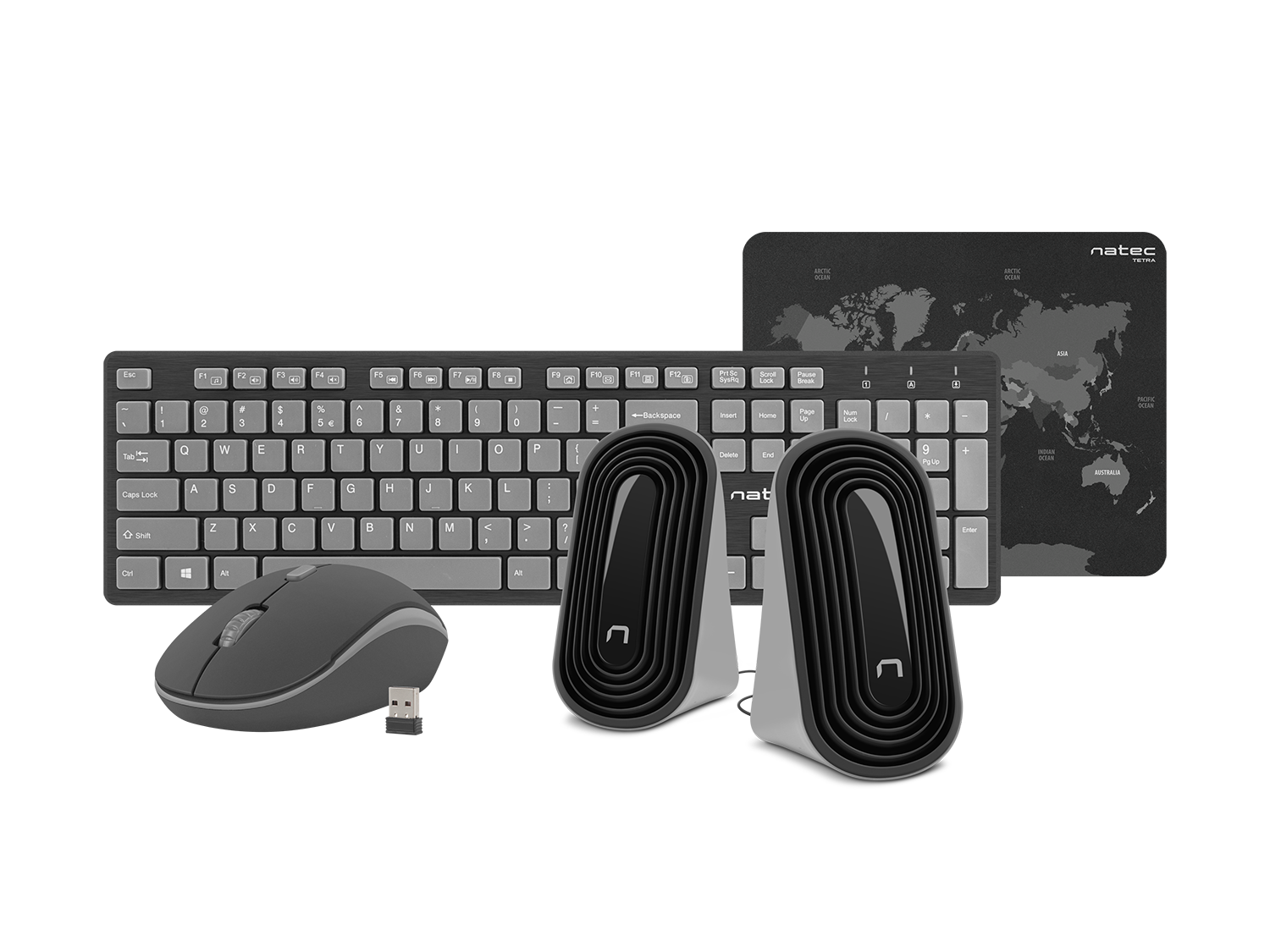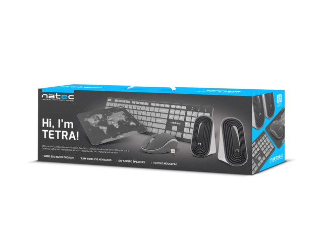- Комплектът включва мишка, клавиатура, подложка и комплект високоговорители. Универсалният и модерен дизайн на отделни елементи и тяхната функционалност причиняват, че Natec Tetra е чудесен избор за почти всяка ситуация.