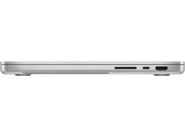 Трансфер на снимки и видеоклипове с четец на карти SDXC. Свържете се с телевизори или дисплеи с HDMI изход. Слушайте с помощта на 3,5-милиметров жак за слушалки, който разпознава и автоматично се настройва за слушалки с висок импеданс. Свържете се с високоскоростни периферни устройства или дисплеи с три порта Thunderbolt 4. И бързо зареждане с помощта на бързо освобождаващия се порт MagSafe 3.