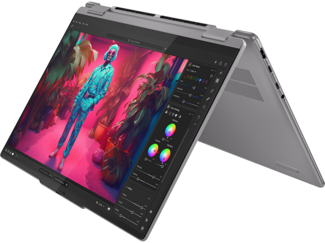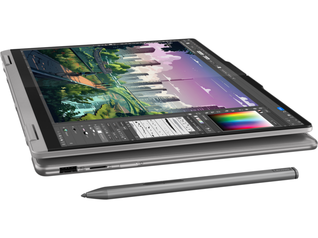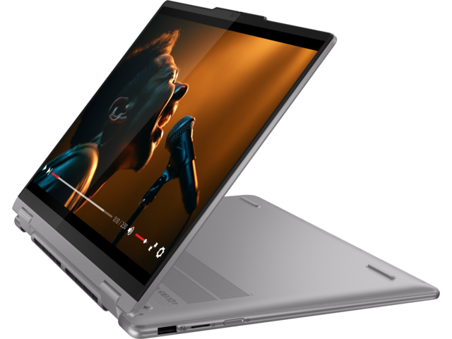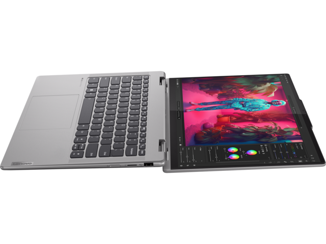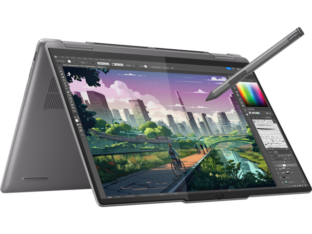 Насладете се на истинско творчество от всеки ъгъл с лаптопа Yoga 7 2-в-1. Изразете себе си в режим на таблет с цифровата писалка, в режим на дисплей за вашите презентации, в режим на стойка, за да се забавлявате без ръце, или работете продуктивно в режим на лаптоп с обширния тракпад. А удобният ръб на корпуса е внимателно проектиран за удобно носене и държане.