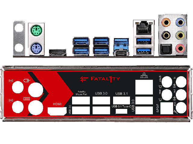 Задният панел на ASRock Fatal1ty X370 Gaming K4 разполага със стандартните PS2 портове за мишка и клавиатура, а от двете страни на тези два входа са локализирани два жака за антени, както и HDMI порт. Следват общо 8 USB порта, от които пет USB 3.0 и два USB 3.1 порта. Списъкът с входове на задния панел се допълва от RJ-45 порт за връзка с интернет и общо шест жака за аудио устройства.