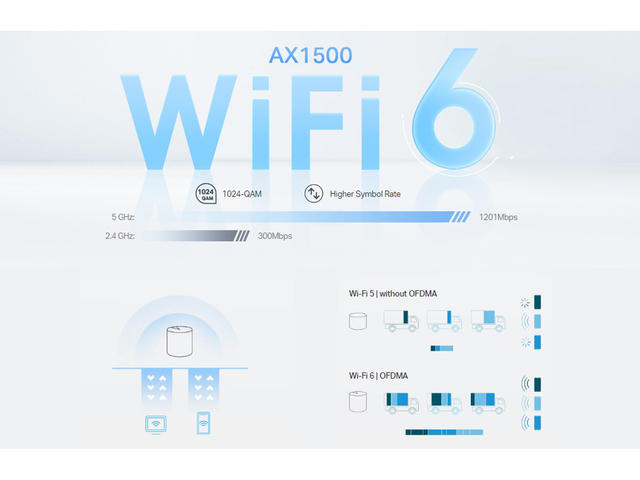 - AX1800 двубандов Wi-Fi 6 скорости - 1201 Mbps (5 GHz) + 574 Mbps (2,4 GHz).