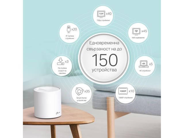Deco X60 изгражда по-ефективна мрежа с 4 пъти по-голяма пропускателна способност на свързаните устройства в плътна среда благодарение на Wi-Fi 6 технологията.