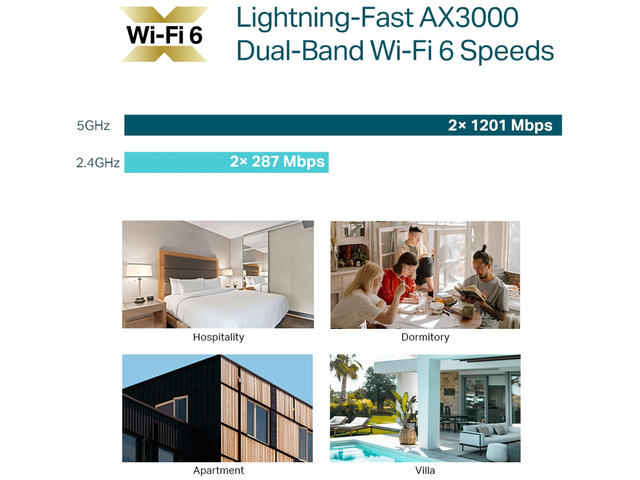 - Изключително бързи AX3000 Wi-Fi 6 скорости: Едновременни 574 Mbps на 2.4 GHz и 2402 Mbps на 5 GHz общо 2976 Mbps.