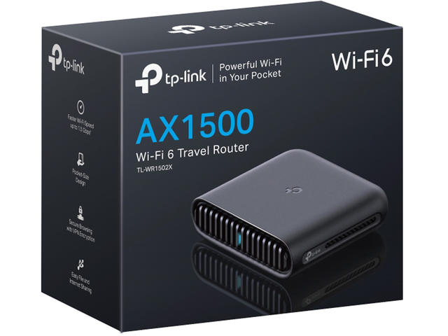 - Преносим и издръжлив дизайн: TL-WR1502X е джобен рутер, компактно проектиран за следващото ви пътуване или приключение. Малкият му размер е създаден за удобно пренасяне.