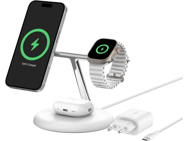 Belkin BOOST CHARGE 3-in-1 Magnetic Wireless Charging Stand with Qi2 15W - White