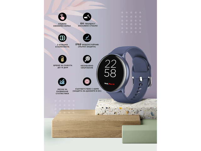 Устойчив алуминиев корпус Ултратънка конструкция Женски календар Голям набор от сензори Оптимизиран за популярни спортове Дистанционно управление на камерата Капацитет на батерията 150 mAh Включени 2 каишки - силикон и кожа Спецификации: