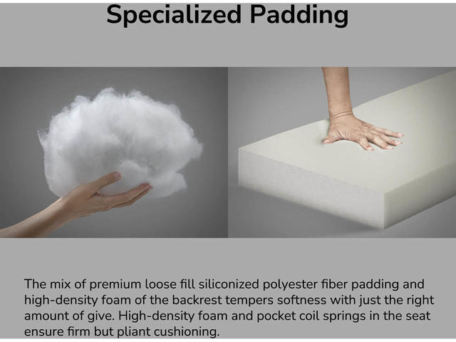 - Комбинацията от първокласен пълнеж от силиконизирани полиестерни влакна и пяна с висока плътност на облегалката смекчава мекотата с точното количество гъвкавост.
