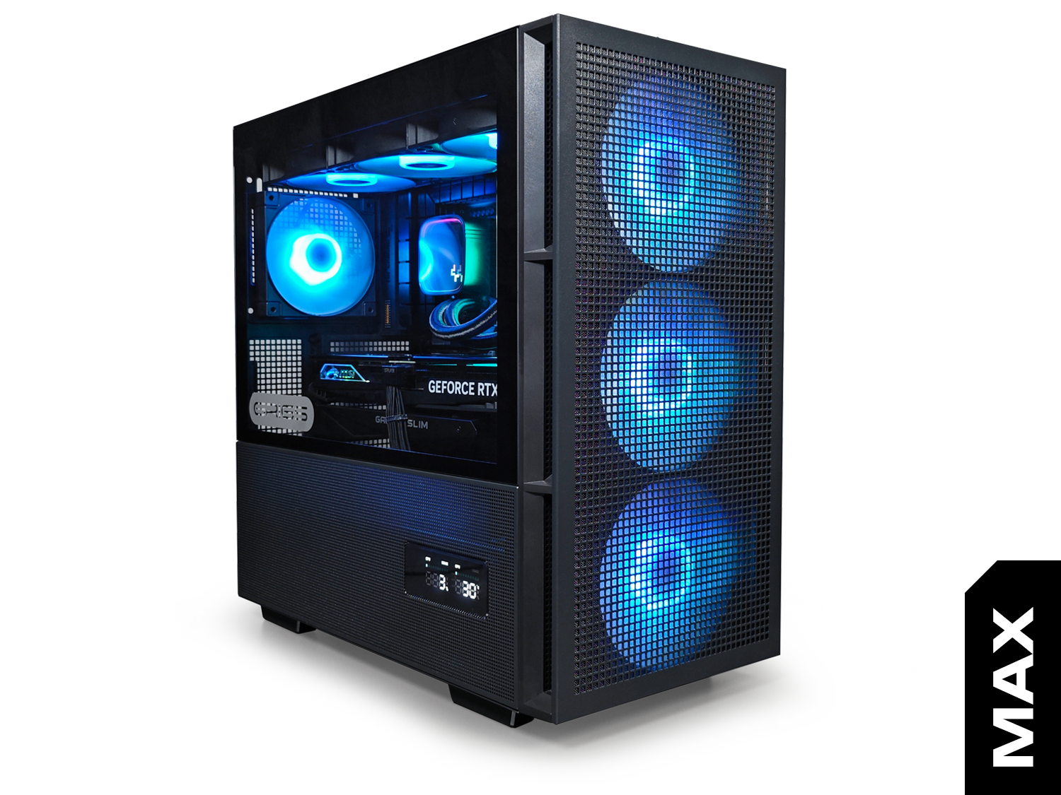Серията SIRIUS вдига нивото на визията. Тази конфигурация впечатлява с прецизно изработена mesh кутия и истинския геймърски акцент – вграден дисплей, който следи в реално време системните показатели и производителността, докато сетъпът ти изглежда убийствено.
