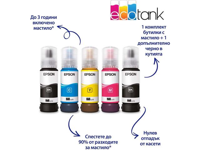 2х бутилки с мастило (черно) - до 8100 страници, 1х бутилка с мастило циан - до 6500 страници, 1х бутилка с мастило магента - до 6500 страници, 1х бутилка с мастило жълто - до 6500 страници