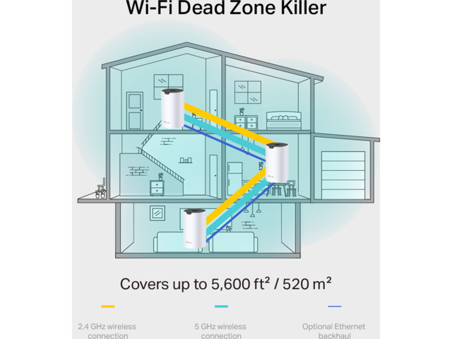 Deco S7 предлага лесен начин да гарантирате силен WiFi сигнал във всеки ъгъл на вашия дом до 5600 квадратни фута (опаковка от 3). † Безжичните връзки и опционалният Ethernet backhaul работят заедно, за да свържат Deco единици, осигурявайки още по-високи мрежови скорости и наистина безпроблемно покритие.