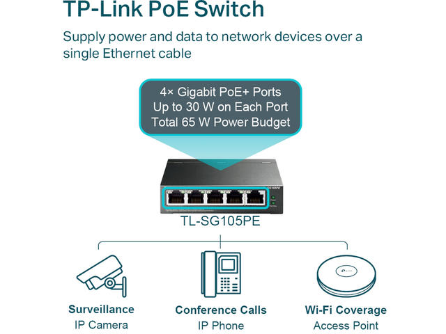 TL-SG105PE е напълно съвместим с PoE устройства, като IP камери, точки за достъп и IP телефони. Той работи и с кабелни устройства, различни от PoE, като компютри, принтери и IPTV.