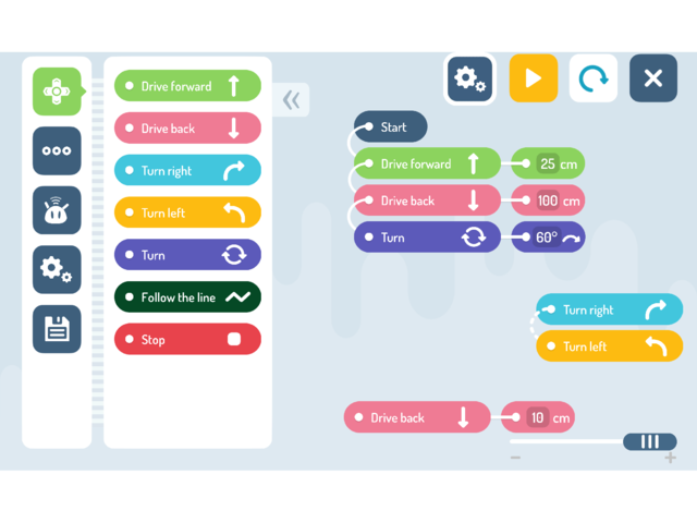 - Сензори: Сензор за светлина/ Сензор за докосване/ Сензор за звук/ Сензор за разстояние/ LED/ Сензор за проследяване
