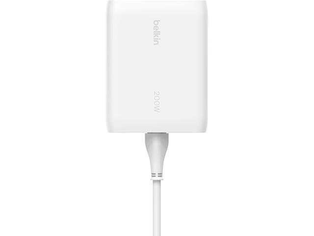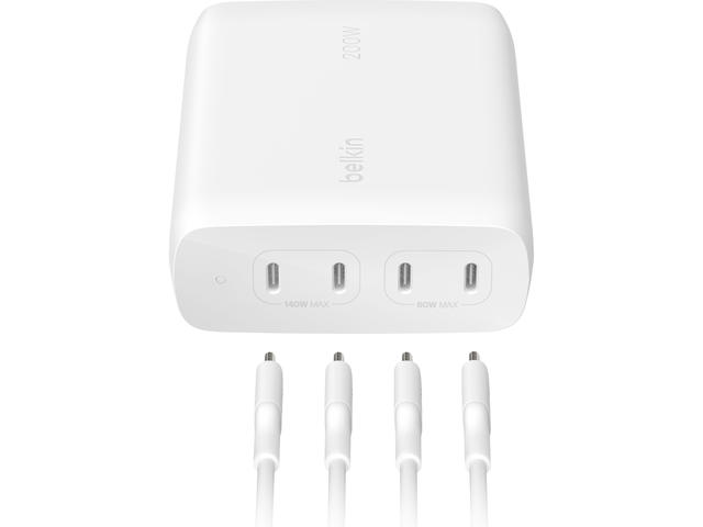 - Интелигентното споделяне на захранването осигурява най-ефективното бързо зареждане за до 4 устройства едновременно, общо 200 W максимална мощност, 140 W максимална мощност на един порт