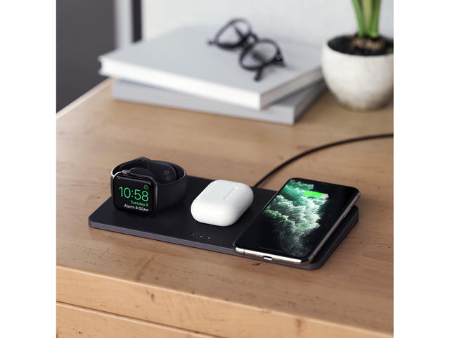 - Зареждай едновременно до три устройства - Apple Watch Series (до 2,5 W), AirPods с калъф за безжично зареждане (до 5 W) и iPhone с поддръжка на Qi (до 7,5 W) или смартфон - всичко това от една елегантна, модерна станция.