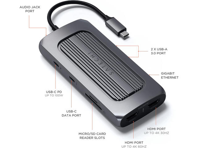 - Мощен, но изключително елегантен, адаптерът разполага с двоен 4K HDMI, Gigabit Ethernet, USB-C PD зареждане, USB-C данни, USB-A данни, четци за SD карти и аудио жак - всичко това само с един USB-C порт.