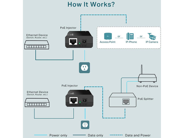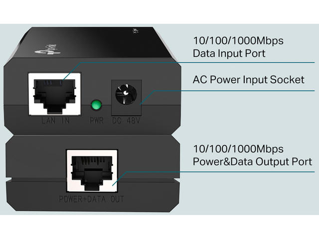 PoE Injector TL-POE150S е в пълно съответствие с IEEE стандарт 802.3af, и може да работи с всички съвместими PD устройства, поддържащи IEEE протокол 802.3af PoE или PoE приемник адаптери, като например TP-Link TL-POE10R, или друг еквивалентен продукт, за да разшири мрежата, там, където няма електропровод или изход. Съдържание на пакета: